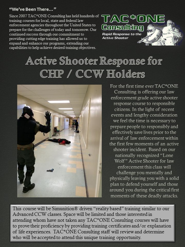 TAC*ONE Consulting is offering our law enforcement grade active shooter response course to responsible citizens. In the light of recent events and lengthy consideration we feel the time is necessary to prepare people to responsibly and effectively save lives prior to the arrival of law enforcement within the first few moments of an active shooter incident. Based on our nationally recognized “Lone Wolf” Active Shooter for law enforcement this class will challenge you mentally and physically leaving you with a solid plan to defend yourself and those around you during the critical first moments of these deadly attacks.