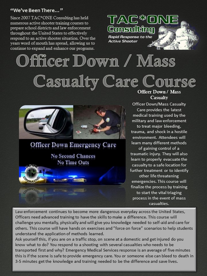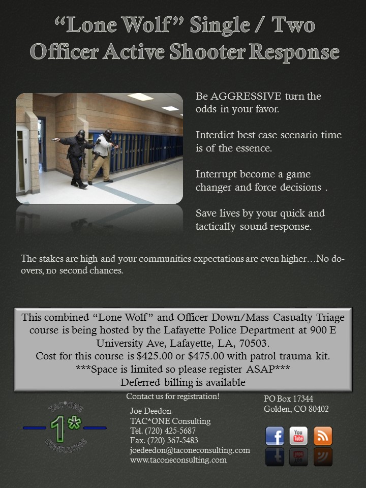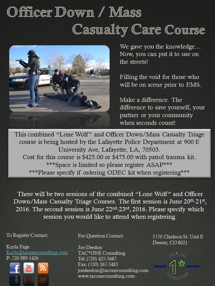This is a combo course of both “Lone Wolf” Singe/Two Officer Active Shooter Response and Officer Down/Mass Casualty Triage. This course is being hosted by the Lafayette Police Department in Lafayette, Louisiana. There will be two sessions hosted by the Lafayette Police Department. The first is June 20th-21st and the second is June 22nd-23rd, 2016. Cost for this course is $425.00 or $475.00 with patrol trauma kit. Please specify which dates you want to attend and if you will need a patrol trauma kit when registering.