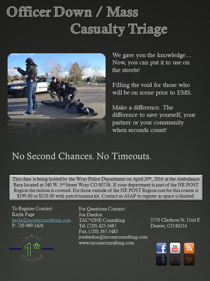 This course is being hosted by the Wray Police Department on April 20th, 2016. Cost for this course is $199.00 or $250.00 with patrol trauma kit. If your department is in the NEPOST region cost for this course is covered.