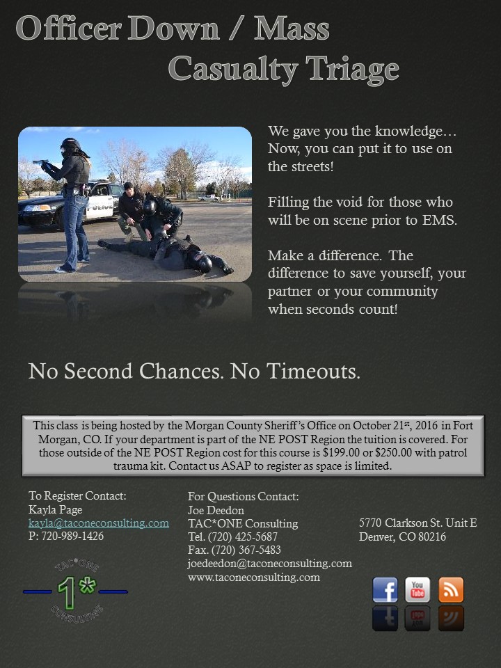 This course is being hosted by the Morgan County Sheriff’s Office in Ft. Morgan, CO on October 21st, 2016. If your department is in the NE POST region, tuition is covered. If you are outside the NE POST region cost is $199.00 per person or $250.00  with patrol trauma kit.