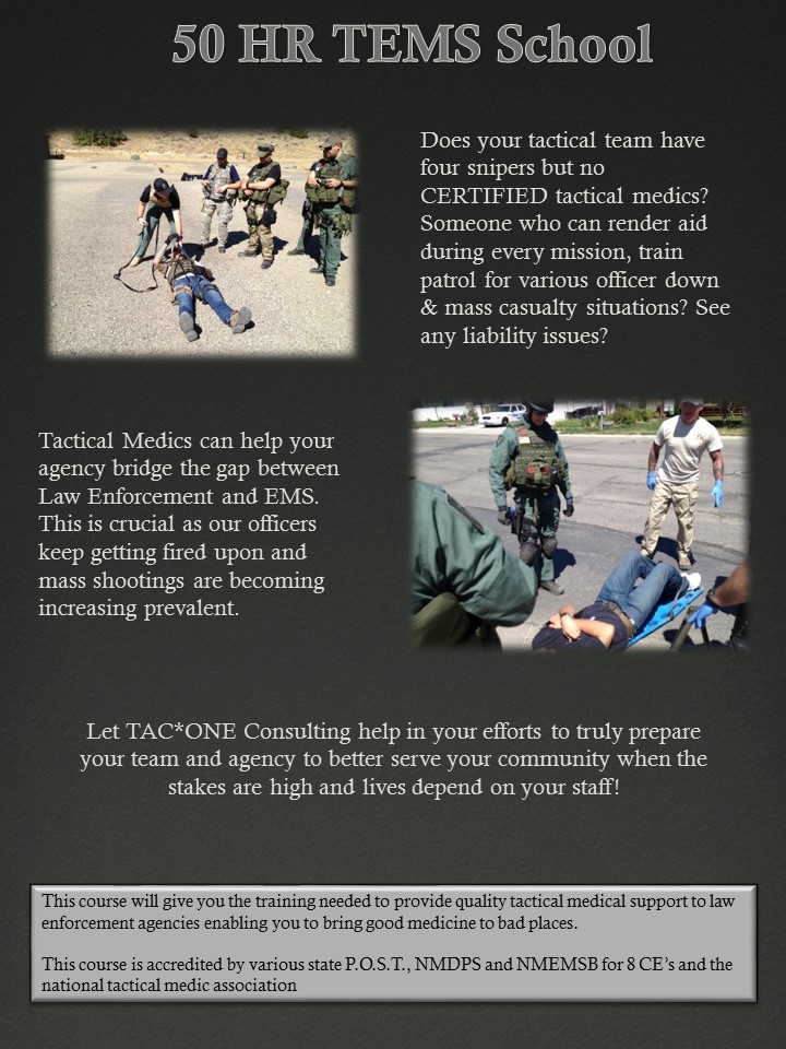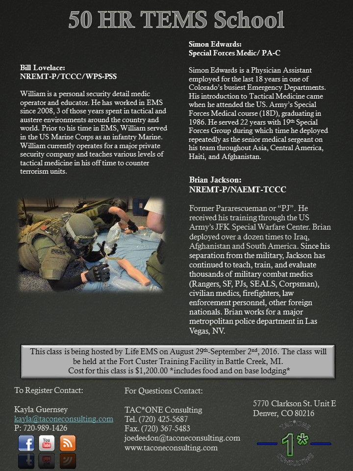 This course is being hosted by Life EMS on August 29th-September 2nd, 2016. Cost for this course is $1,200.00 per student which includes meals for the week and on base housing.